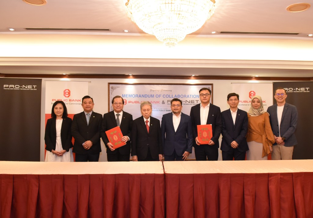 Public Bank menandatangani Memorandum Kerjasama (MoC) dengan Proton New Energy Technology Sdn Bhd (PRO-NET) Rabu lepas bagi penyediaan kemudahan pembiayaan produk dan perkhidmatan kewangan lengkap dan memulakan pendigitalan melalui penyepaduan sistem dengan smart Malaysia dan penjual sahnya.