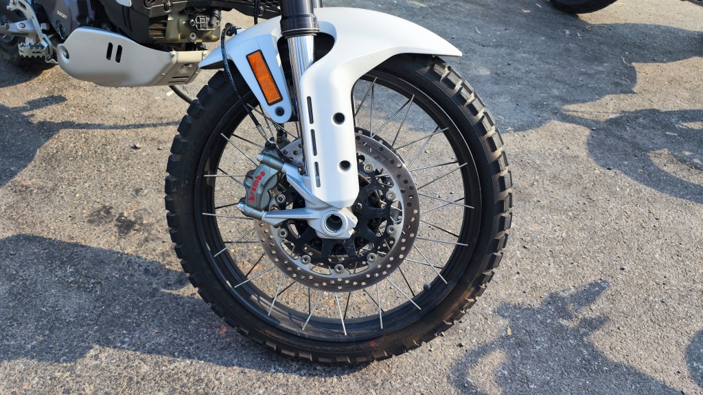 Skim warna merah menyala selalunya menjadi imej atau watak kepada jentera-jentera Ducati. Namun kali ini, warna putih menjadi pilihan ahli keluarga terbaru jenama Italia ini. Motosikal jenis lasak ini sudah tentu didatangkan dengan pelana atau tempat duduk yang agak tinggi. Saya yang mempunyai ketinggian 183cm (6 kaki), berupaya untuk memijak permukaan dengan kemas namun sekiranya anda kurang daripada 5’5”, anda harus berkebolehan untuk mengimbangi motosikal dengan baik yang mana saya lihat sendiri apabila seorang peserta dari Korea yang terpaksa ‘menggantung’ sebelah kakinya bagi membolehkan kakinya yang lagi satu memijak permukaan ketika konvoi kami berhenti di lampu isyarat.