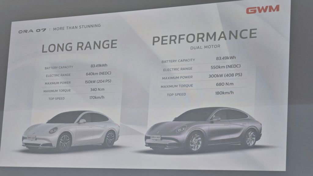 Dipasarkan dengan warna kelabu unggul, ungu dan putih, ORA 07 mengajak para pencinta mobil memilih kekuatan yang manakah diinginkan. Pilihan antara varian yang mampu mencapai jarak pemanduan yang jauh dengan sekali pengecasan atau prestasi kelajuan kenderaan yang hebat. GWM ORA 07 dikuasakan oleh bateri lithium 83.499 kwh terkini. Untuk versi pemanduan jauh, ianya mampu mencapai 640 km dari kuasa penuh bateri, menghasilkan 150 kW (204 PS) kuasa, 340 Nm tork. Sementara varian prestasi kelajuan pula menghasilkan 300 kW (408 PS) dan 680 Nm tork, dann mampu mencapai jarak 550km dari kuasa penuh baterinya.
