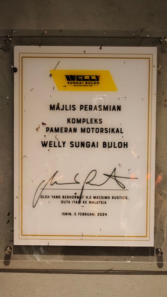 Meneruskan legasi Welly Motorcycle Sg Buloh, Motoplex Sg Buloh dijangka menambah impak keberadaan jenama-jenama hebat Itali seperti yang disebutkan tadi. Ini secara tidak langsung, menghasilkan ‘pertalian’ dengan kedutaan Itali di Malaysia, yang mana telah merasmikan upacara pembukaan ruang pamer Motoplex Sg Buloh ini dan diabadikan dengan pemasangan Plaque di pintu masuk Motoplex Sg Buloh ini.