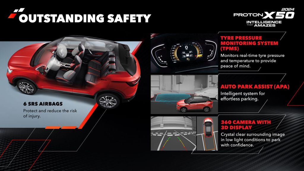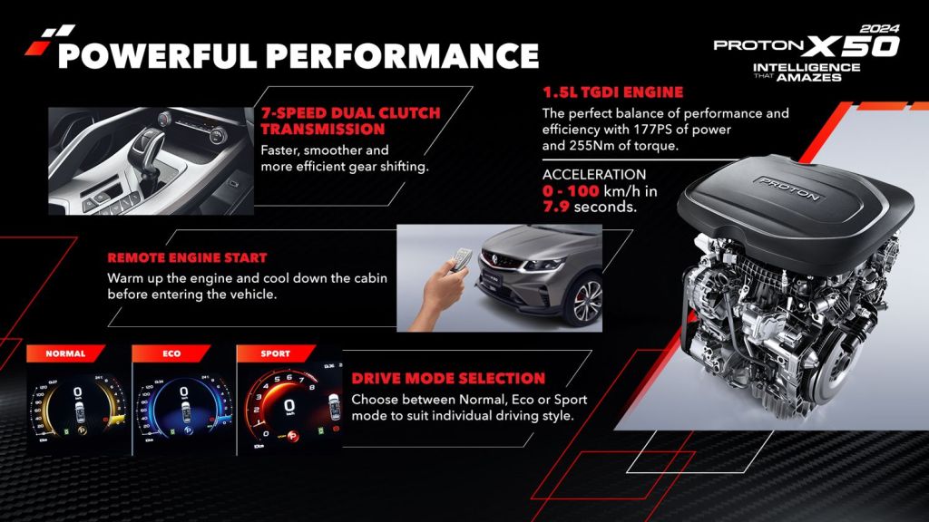Di tengah-tengah 2024 PROTON X50 adalah enjin suntikan langsung turbocharged 1.5 liter dengan output kuasa 177 PS dan 255Nm tork, dipadankan dengan transmisi dwi-klac 7-kelajuan. Gabungan ini membenarkan SUV untuk mencapai masa pecutan 0-100km/j dalam hanya 7.9 saat. Keselamatan terdapat dalam bentuk 6 beg udara SRS, Kawalan Kestabilan Elektronik (ESC), 8 Sistem Bantuan Pemandu Peringkat 2 (ADAS) dan Sistem Pemantauan Tekanan Tayar (TPMS).