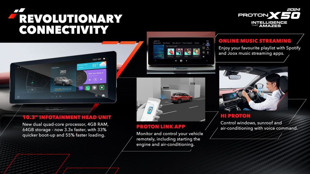 Unit kepala infotainment (IHU) 10.3” pada 2024 PROTON X50 telah dinaik taraf dengan unit pemproses dual quad-core baharu yang menyediakan kelajuan but yang lebih pantas dan masa pemuatan yang lebih cepat. Ini