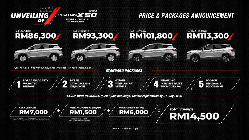 Peningkatan produk kepada 2024 PROTON X50 memberikan nilai tambahan RM6,000 kepada pembeli, tetapi PROTON mengekalkan harga SUVnya. Syarikat juga memperkenalkan Pakej Early Bird terhad yang menawarkan rebat sehingga RM8,500 kepada 5,000 pelanggan pertama yang mendaftarkan pembelian baharu mereka pada 31