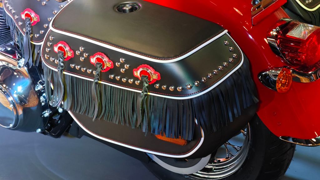 - Leather and vinyl saddlebags detailed with chrome conchos with acrylic red centers, chrome studs and leather fringe, white seam piping and red contrast stitching.