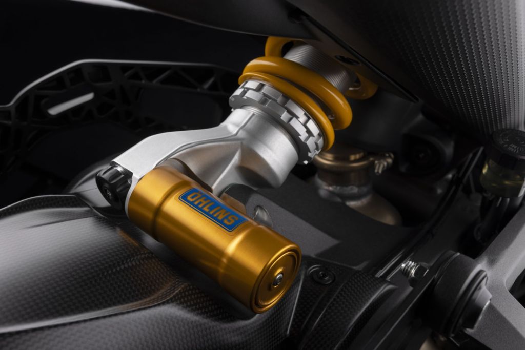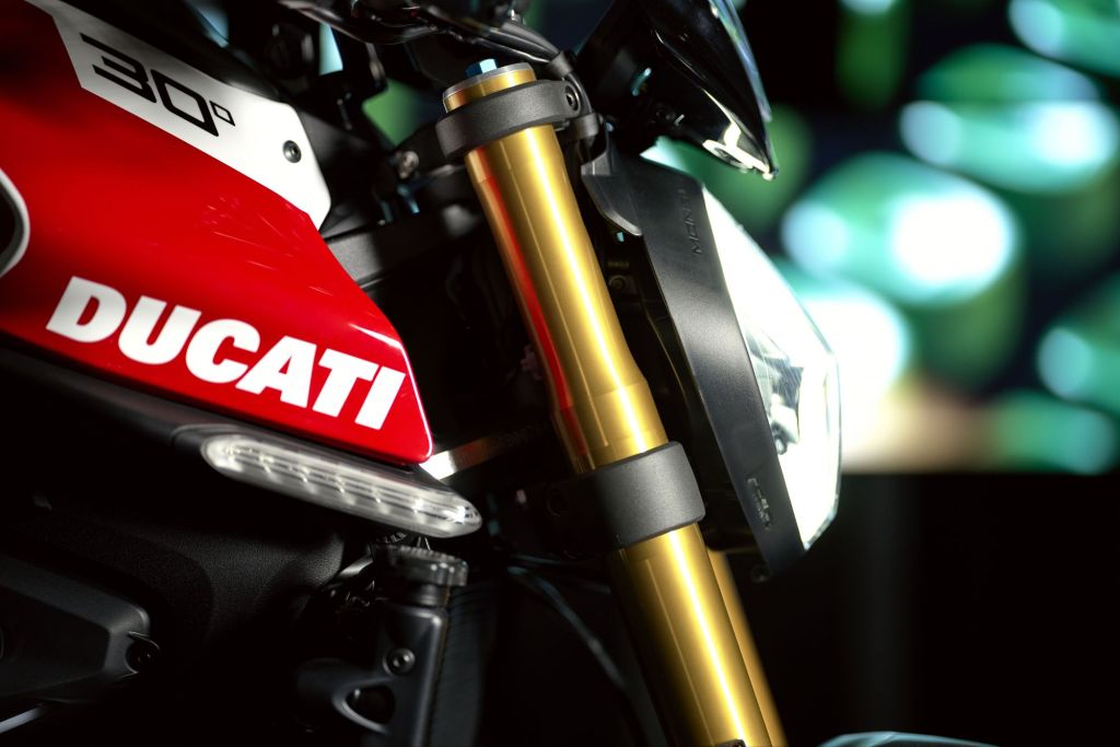 - Fully adjustable Öhlins NIX30 fork, Öhlins rear monoshock, and Öhlins steering damper to heighten the Monster’s intrinsic handling qualities