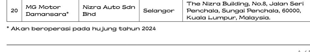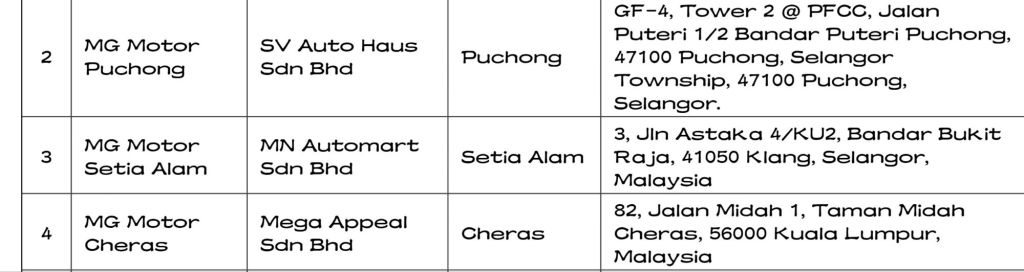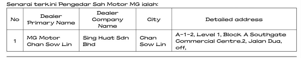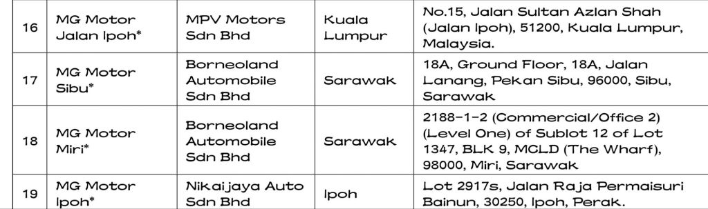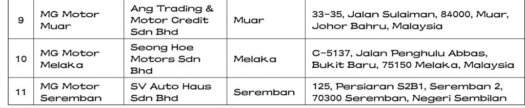 Senarai terkini Pengedar Sah Motor MG ialah: