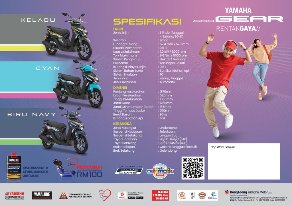 The 2024 Yamaha EGO Gear in the new color selection will be available at all authorized Yamaha dealers nationwide starting from 15th October 2024, with a recommended retail price of RM 5,998.00 excluding registration fees and insurance coverage.