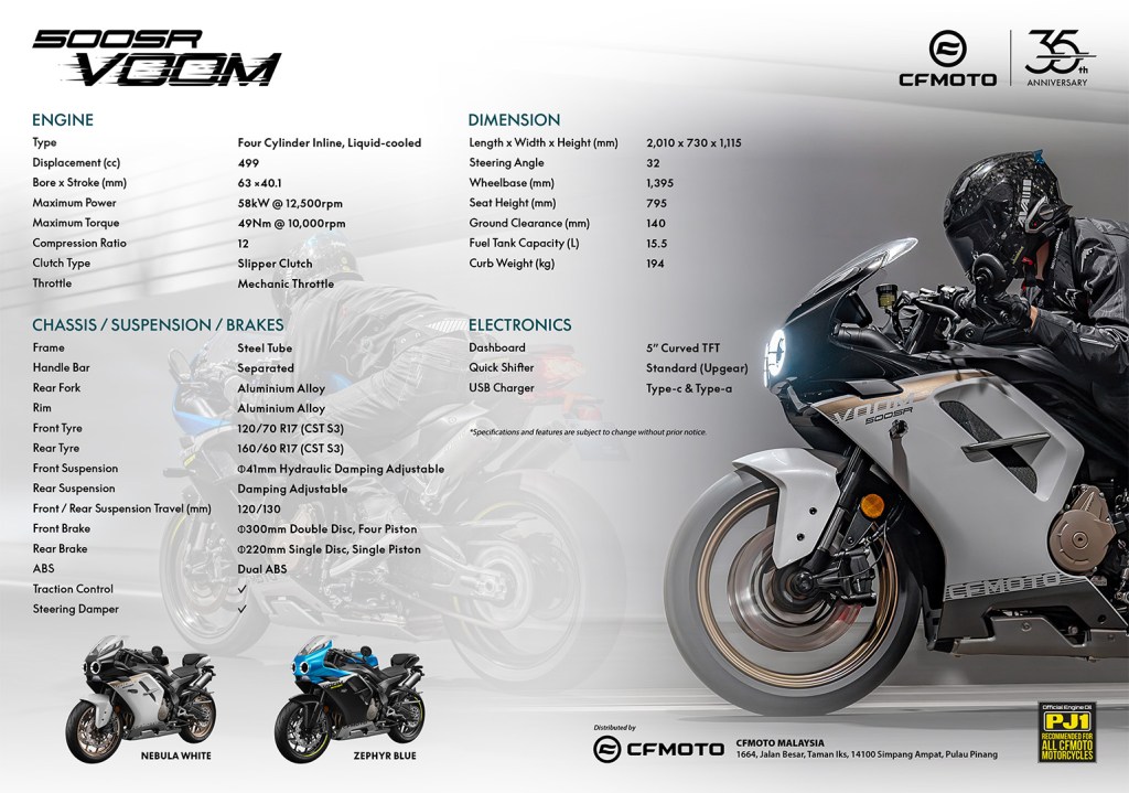 CFMOTO 500SR VOOM juga mempunyai tapak roda 2,010mm, kelebaran 730mm, ketinggian 1,115mm serta mempunyai ketinggian tempat duduk setinggi 795mm. Saiz motosikal yang bersifat sederhana ini sangat ideal untuk penunggang tanpa mengira saiz. Dengan setiap pembelian CFMOTO 500SR VOOM, para pembeli boleh menikmati jaminan waranti perbatuan tanpa had untuk tempoh dua tahun serta perkhidmatan pembelian alat ganti tulen atas talian oleh CFMOTO Malaysia.