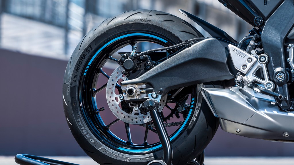 Motosikal ini dipasang dengan tayar jenama CST model S3 bersaiz 120/70 R17 pada roda hadapan dan saiz 180/55 R17 pada roda belakang, yang memperoleh