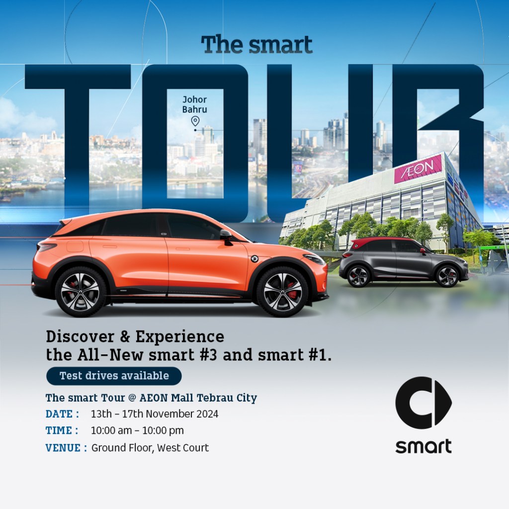 smart Malaysia mengumumkan smart Tour Roadshow kini di Aeon Tebrau yang berlangsung dari 13 hingga 17 November 2024. smart Tour ini mengajak semua warga Johor untuk merasai keunggulan kenderaan elektrik smart #1 dan #3 sekaligus meraikan pencapaian penting dalam mobiliti elektrik ini dan ulang tahun smart.