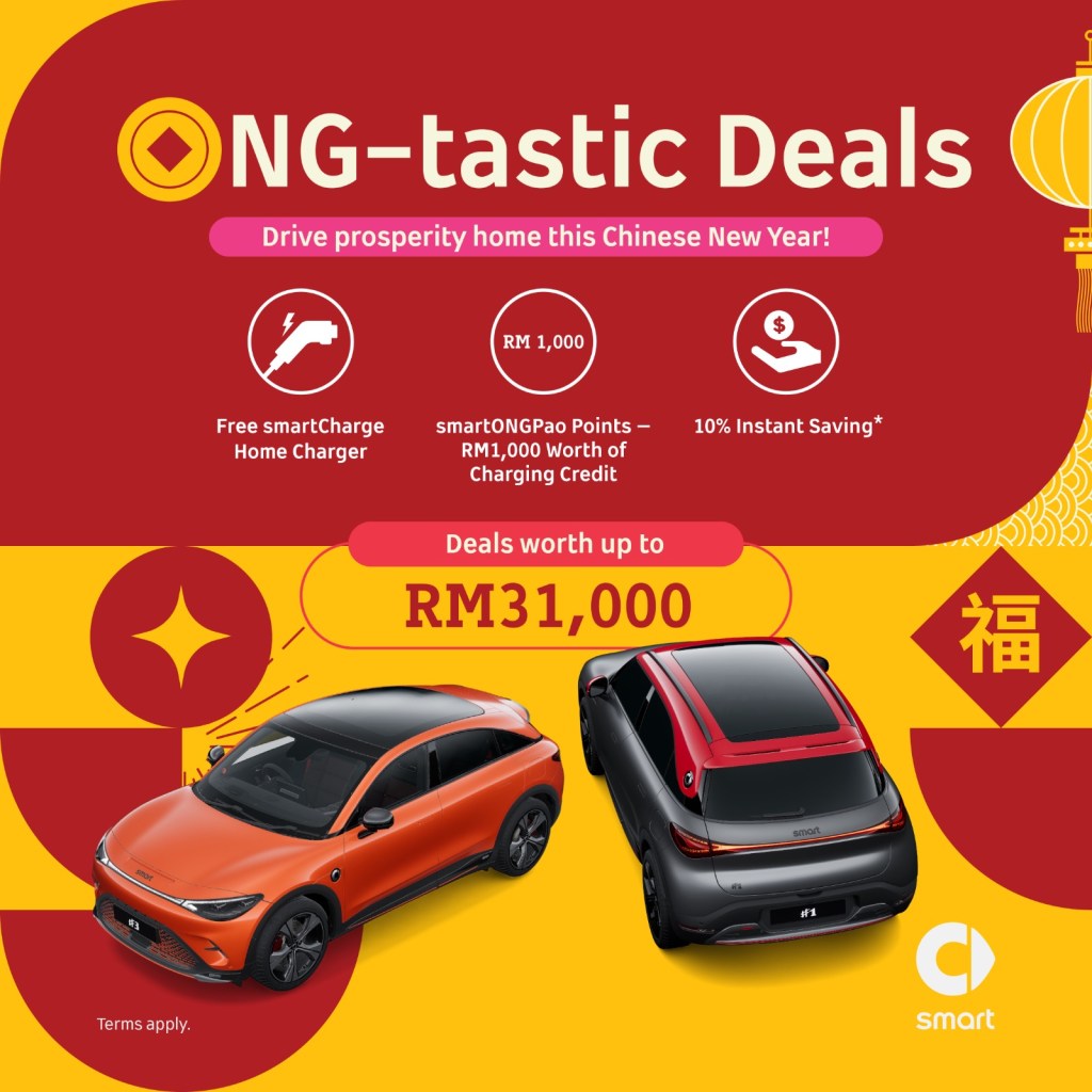 Pelanggan yang membeli smart #1 atau smart #3 semasa kempen ini berlangsung akan menerima smartCharge percuma dengan pemasangan standard, memberikan kemudahan pengecasan di rumah dengan lancar. Selain itu, smartONGPao yang dilengkapi dengan 100,000 mata ganjaran bernilai RM1,000 dalam kredit pengecasan, memastikan kemudahan pengecasan yang lancar sepanjang tahun untuk perjalanan EV anda.