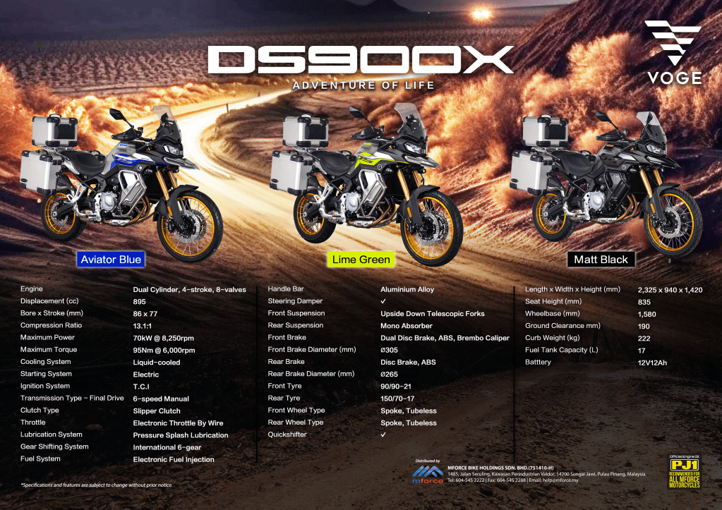 sebuah model terbaru yang penuh dengan ciri-ciri inovatif dan berprestasi tinggi dari jenama VOGE iaitu model DS900X. Diperkenalkan oleh MForce Bike Holdings Sdn. Bhd., motosikal ini dijual pada harga RM49,998 (tidak termasuk cukai jalan dan insurans) dan kini boleh