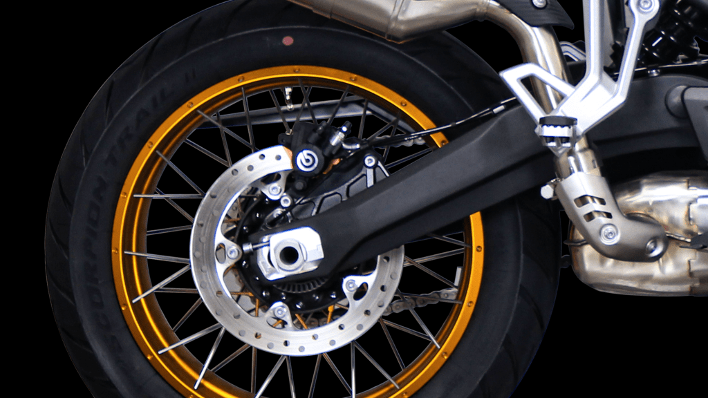 belakang 150/70-17 inci jenis spoke tubeless, memberikan cengkaman luar biasa bagi laluan mencabar.
