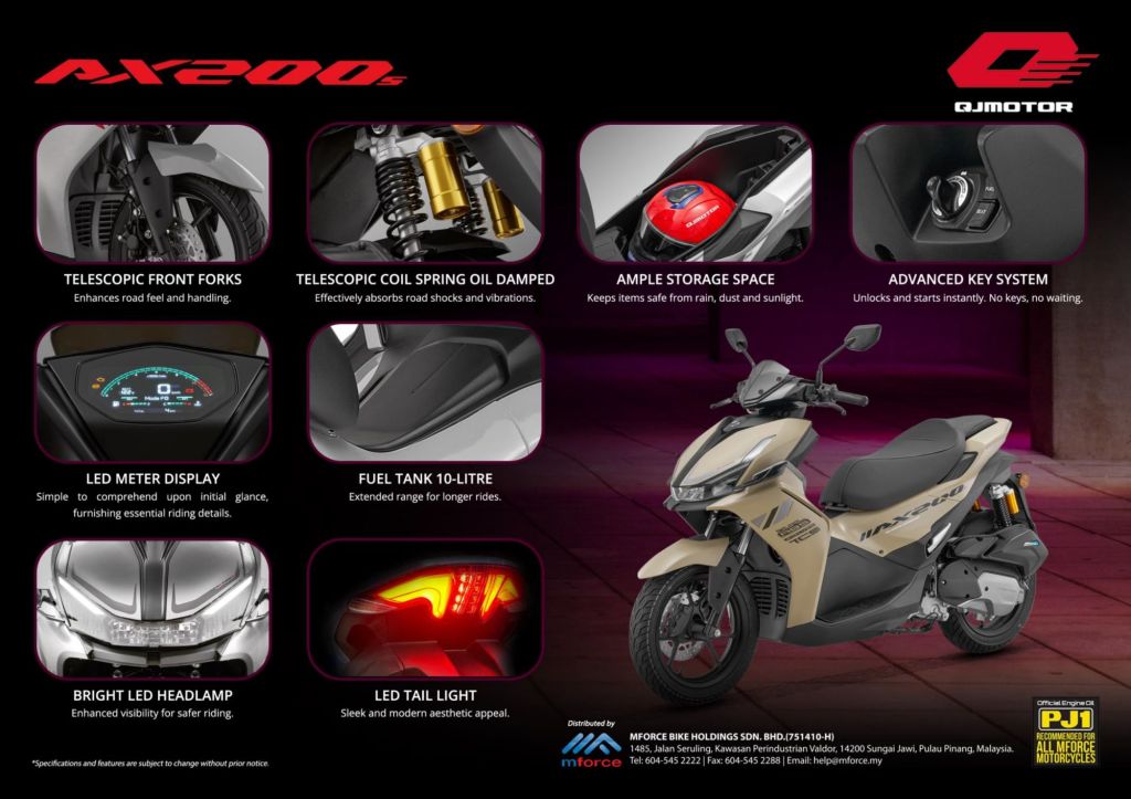 Dikelaskan sebagai skuter ‘commuting’, QJMOTOR AX200S merupakan pilihan ideal dengan penawaran harga bermula RM7,988.00 (tidak termasuk cukai jalan dan insurans). QJMOTOR
