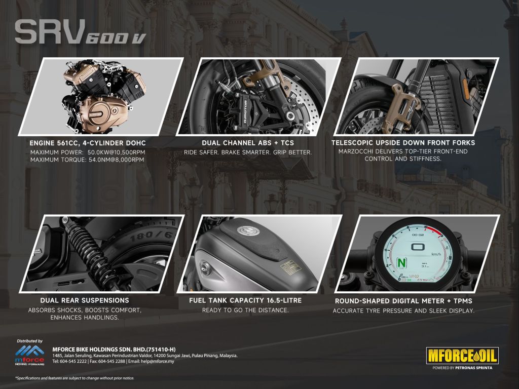 180/65-16 yang memberikan cengkaman yang baik dan ketahanan tinggi. Dari segi teknologi dan kemudahan, QJMOTOR SRV600V dilengkapi dengan lampu hadapan, belakang dan isyarat jenis LED yang bergaya, meter digital berbentuk bulat lengkap dengan sistem pemantauan tekanan tayar (TPMS), ekzos berkembar di kiri dan kanan, penyerap hentak dua unit, port USB jenis Type-A dan Type-C serta tempat duduk dua tingkat yang selesa untuk perjalanan jauh.