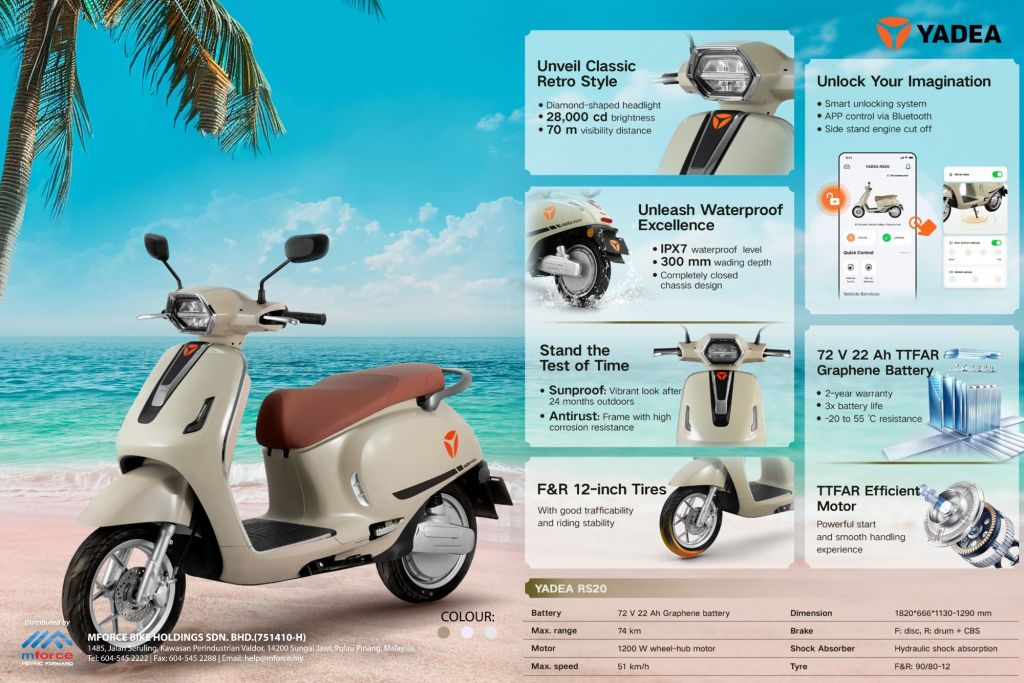 Melalui setiap pembelian YADEA RS20, para pembeli boleh menikmati jaminan pengeluar selama dua tahun atau jarak perjalanan 20,000km (yang mana tiba dahulu) tertakluk kepada terma dan syarat. Para pembeli juga boleh menikmati pembelian alat ganti tulen atas talian oleh Mforce Bike Holdings Sdn. Bhd.