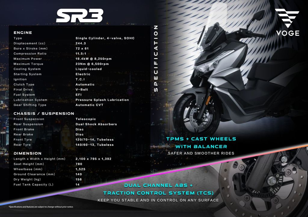 VOGE SR3 turut dilengkapi dengan suis keselamatan tapak sisi dan sistem pelinciran jenis tekanan dan percikan bagi memastikan operasi enjin yang lancar dan tahan lama. Bagi setiap pembelian VOGE SR3, para pembeli boleh menikmati jaminan waranti perbatuan tanpa had untuk tempoh dua tahun serta perkhidmatan pembelian alat ganti tulen atas talian oleh VOGE Malaysia.
