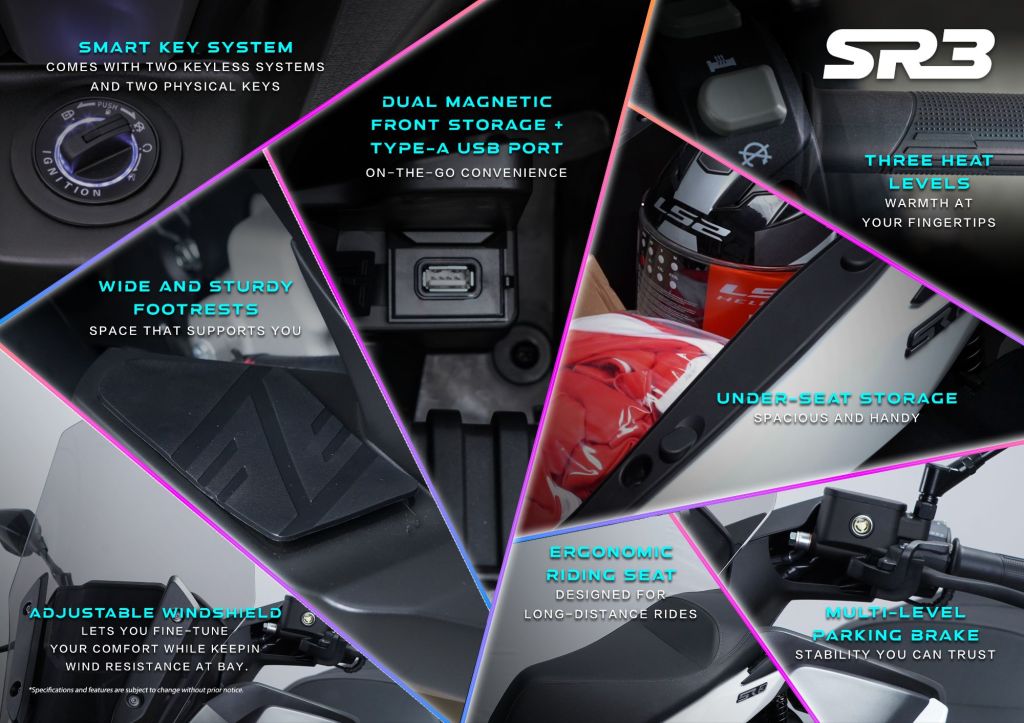Dari aspek keselesaan, VOGE SR3 hadir dengan tempat duduk ergonomik dwi-lapisan, cermin penghadang angin boleh laras serta pemanas pemegang dengan tiga tahap larasan, menjadikan tunggangan jarak jauh lebih selesa.