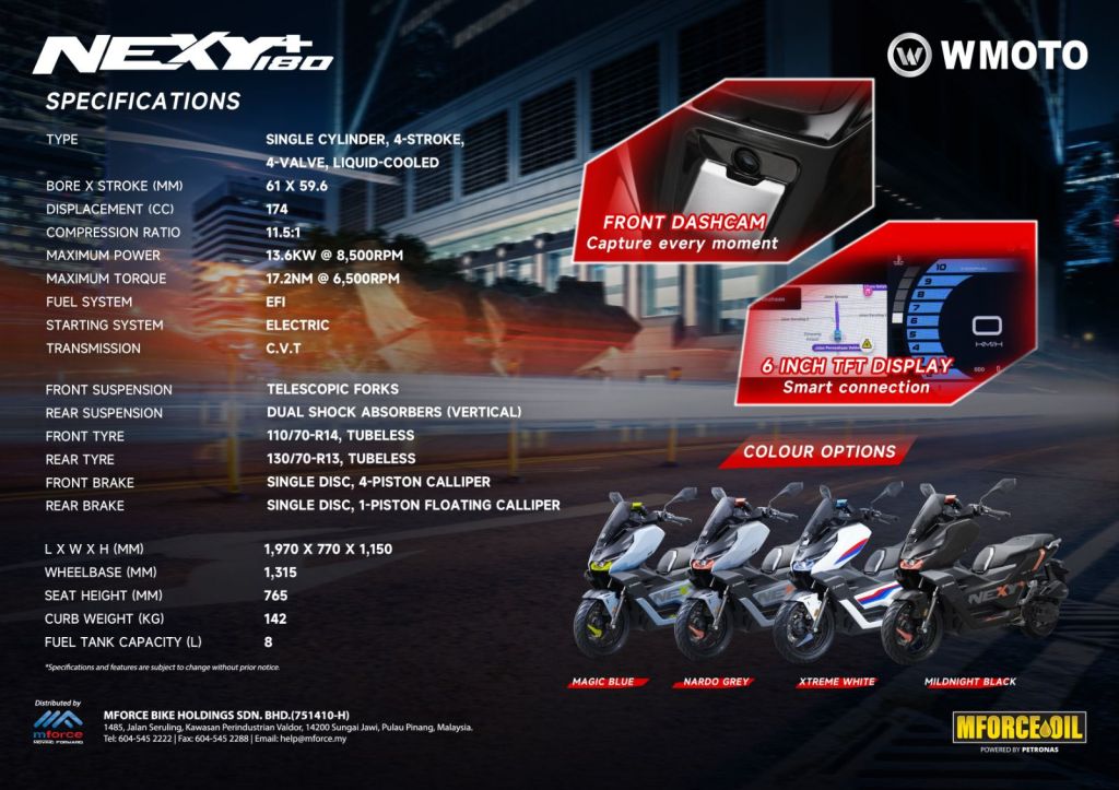 penyejukan cecair, WMOTO Nexy+180 menghasilkan kuasa maksimum 13.6 kW pada 8,500 rpm dan tork puncak 17.2 Nm pada 6,500 rpm. Dengan nisbah mampatan 11.5:1 serta piston (61 mm) dan lejang (59.6 mm), skuter ini menawarkan prestasi