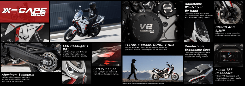 Bersesuaian dengan gabungan prestasi berkuasa ini, komponen premium dan teknologi terkini, Moto Morini X-CAPE 1200 menetapkan penanda aras baharu dalam segmen adventure