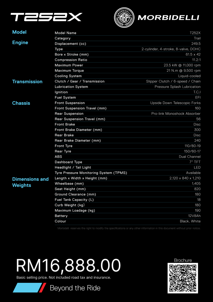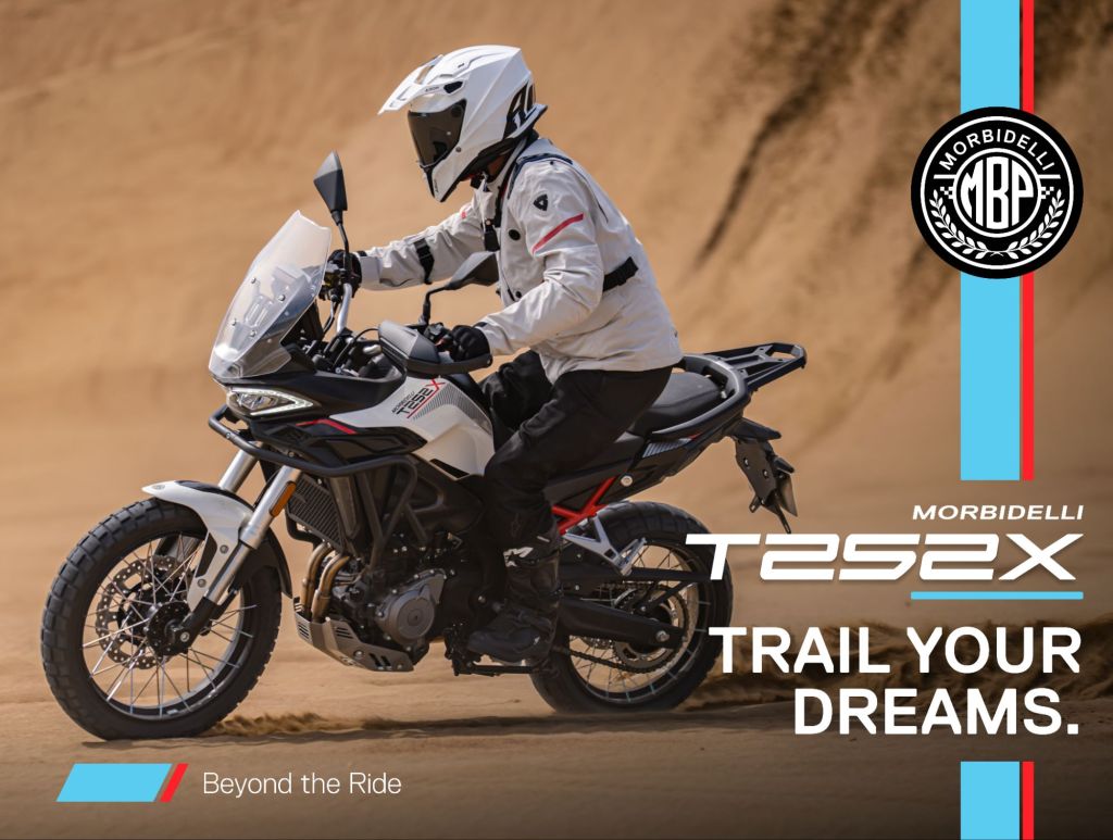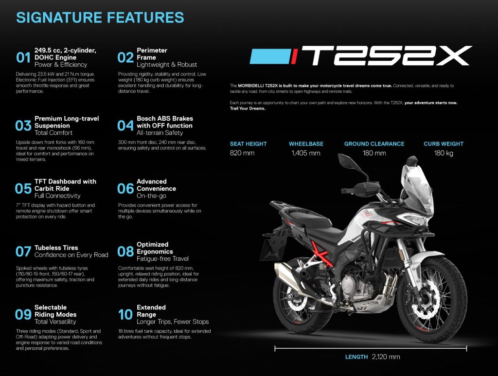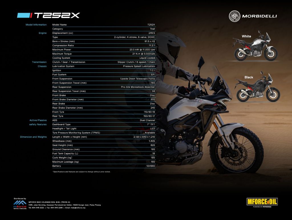 Morbidelli T252X hadir dengan dua pilihan warna iaitu Bulk Black dan Tundra White, sesuai untuk penunggang yang mencari motosikal kembara ringan dengan keupayaan pelbagai permukaan. Morbidelli T252X dikuasakan oleh enjin 249.5 cc dua silinder, 4-lejang, 8-injap DOHC, yang menghasilkan kuasa maksimum 25.0 kW pada 12,000 rpm dan tork maksimum 20.0 Nm pada 10,000 rpm, dengan nisbah mampatan 11.2:1. Enjin ini menampilkan ukuran piston dan lejang 61.5 × 42 mm, serta dipadankan dengan transmisi 6-kelajuan dan sistem pacuan akhir rantai, bagi memastikan penghantaran kuasa yang lancar